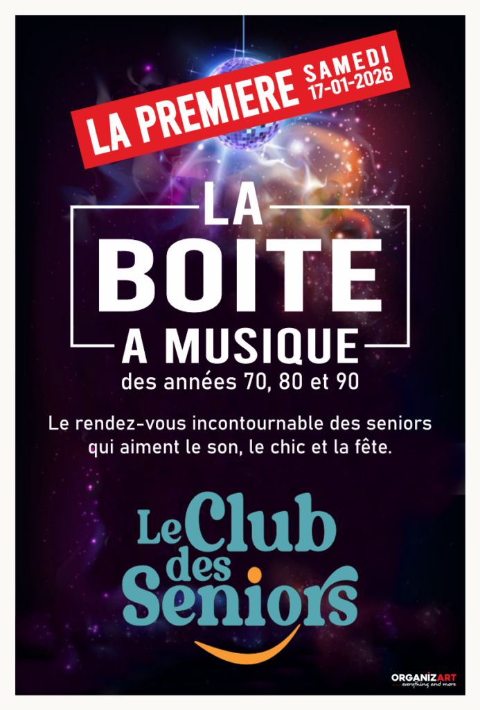 (ID #15) (ID #15) Au programme dès 18h00 : Participation au frais 25 euros comprenant : – Accueil : drink et tapas – Présentation du concept du Club des Seniors – Présentation du concept de La Boîte à Musique – Animations | Blind test | Karaoké – Soirée dansante animée par dj Les plus : – Bar et petite restauration – Sanitaire gratuit – Accès aux personnes à mobilité réduite – Grand parking sécurisé – Le lieu :– Surprise de taille, il vous sera communiqué début janvier 2026. Veuillez activer JavaScript dans votre navigateur pour remplir ce formulaire.Genre *MmeMrNom *PrénomNomE-mail *Téléphone ou mobile * Téléphone Genre Pour Ville *Liste déroulante *-- Sélectionner un choix --BelgiqueFranceLuxembourgEspagneItaliePortugalPays-BasAllemagneJe souhaite participer à la Première de La Boîte à Musique *La Boîte à Musique du 17 janvier 2026Pour vous aidez au mieux, n'hésitez pas de nous laisser plus d'informations sur vous, vos activités, vos passions,...Captcha * = Envoyer